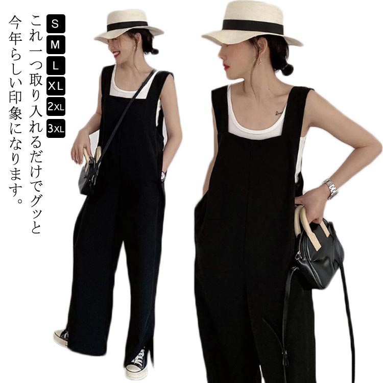 春夏 ネック レディース オールインワン サロペットパンツ 肩紐 調節可能 黒 ベージュ サロペットパンツ