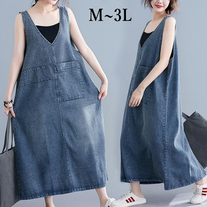 サロペットスカート ジャンパースカート オーバーオール オールインワン デニムワンピース ロング丈 デニムノースリーブ 体型カバー マキシ丈 レディースワンピース 大きめ 春 夏ワンピース M L2L