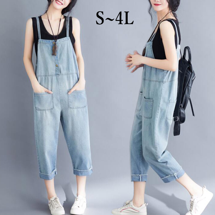 デニムサロペット サロペット オールインワンデニムパンツ サルエルパンツポケットボトムス9分丈 ロング デニムノースリーブ レディース大きいサイズ 春 夏 2 3