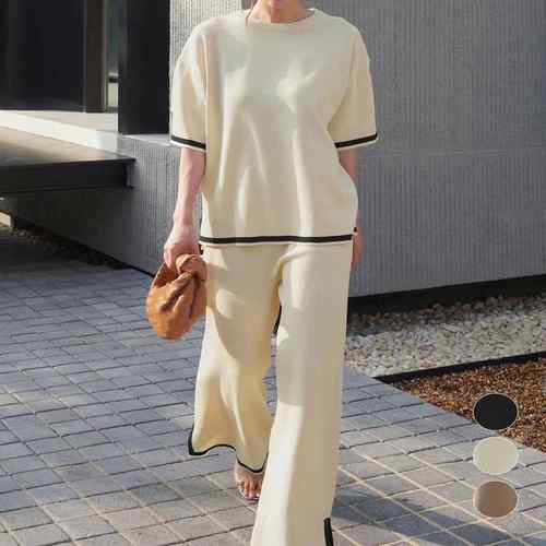 ラウンドネックニット ウエストゴムワイドパンツ オフィスカジュアル服セットアップ 体型カバー半袖2点セット 30代40代 韓国ファッション秋 ニットパンツセット 春夏上下セット無地