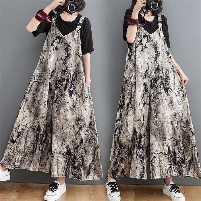サロペット オーバーオール レディース オールインワン ガウチョパンツ 春 夏 秋 パンツ ロング丈 プリント 総柄 ノースリーブ ワイドパンツ 体型カバー おしゃれ ゆったり カジュアル ビーチ リ