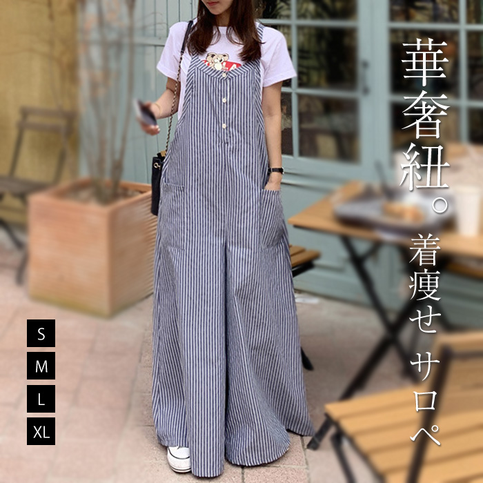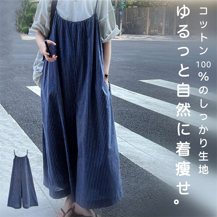 自然に着瘦せ 綿100% サロペットワイドパンツ 大きいサイズ M L 春 夏 秋 総柄 ボーダー柄 ストライプ柄 日常 デート 通勤 通学 着回し ママコーデ 20代 30代 40代 50代 ♪