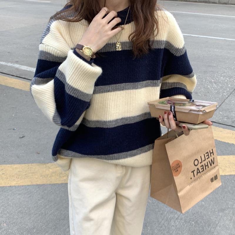 クルーネック ボーダー オーバーサイズ ニット 長袖 トップス セーター あったかレディースファッション トップス ニット セーター セーター