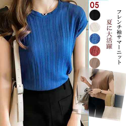 韓国風 ニットトップス フレンチスリーブ ニット プルオーバー おしゃれ ニットカットソー クルーネック 夏服 オフィスカジュアル 夏トップス 着やせ シンプルリブニット