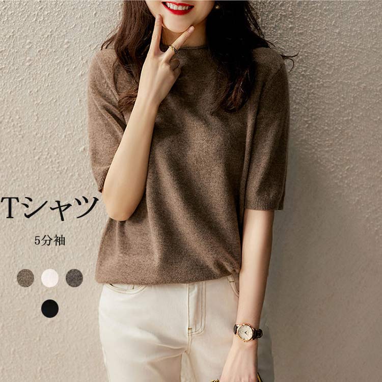 Iラインシルエットですっきり魅せの五分袖夏ニットプルオーバー サマーニット レディース 春 夏 ニット トップス 薄手 プルオーバー