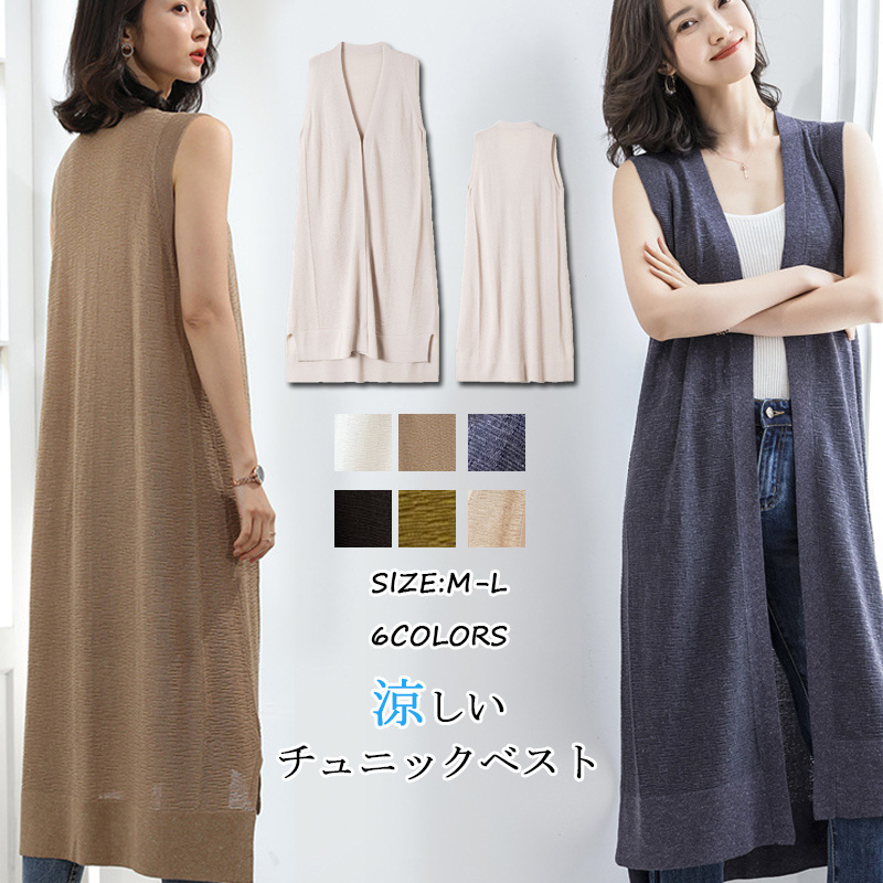 接触冷感ロングジレ ニットソー カットソー カーディガン uv カーデ ガウン アウター 羽織 おしゃれ 春 秋 ベスト ホワイト カーキ グレー ブラック グリーン ベージュ M L
