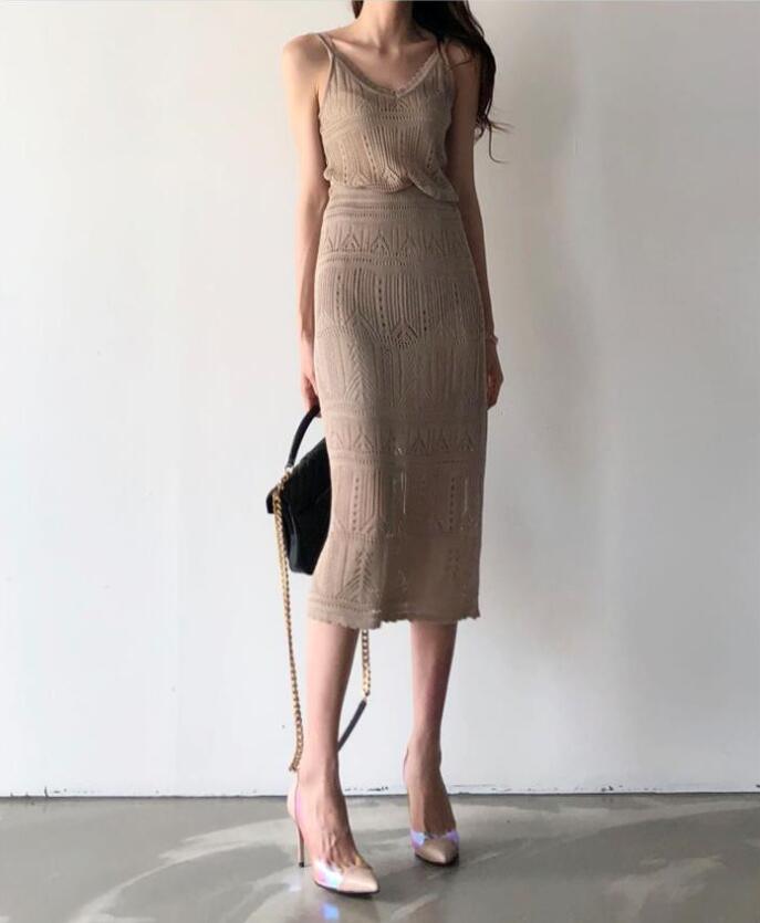 ニットセットアップサマーニットキャミソールノースリーブニットタンクトップスカートセットトップス レディース ロングスカートミモレ丈スカートタイトスカート通勤 オフィス裏地ありゴムウェスト