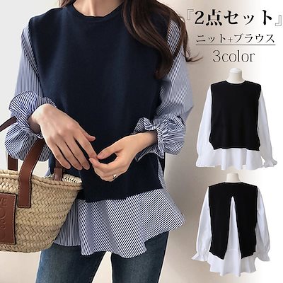 秋新作2点セット ニット+ブラウス セットアップ おしゃれ 可愛いレディースファッション トップス ニット セーター セーター