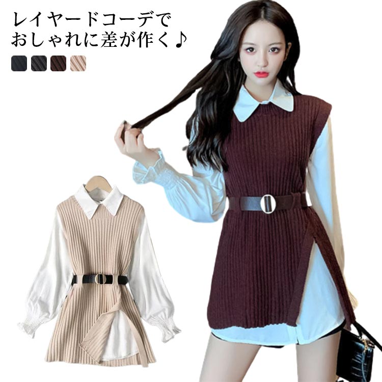 ニットベスト ブラウス シャツ 2点セット レイヤード 重ね着 パフ袖 長袖シャツレディースファッション トップス ベスト ジレ