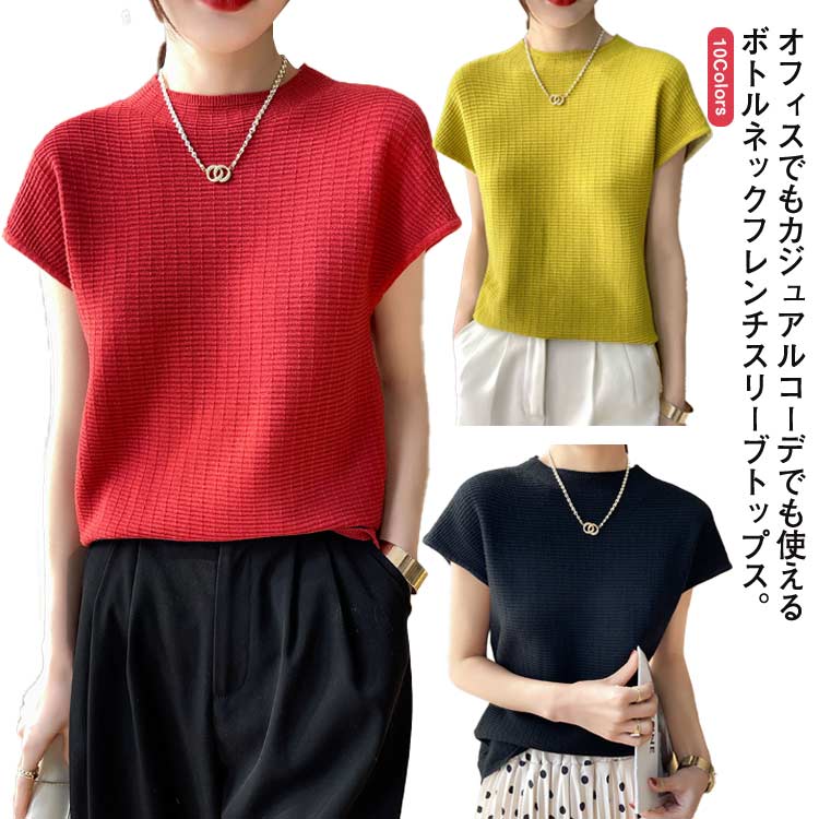 オシャレ魅せサマーニット ニの腕カバー フレンチ袖 ニットトップス 夏服 ボトルネックレディースファッション トップス Tシャツ カットソー