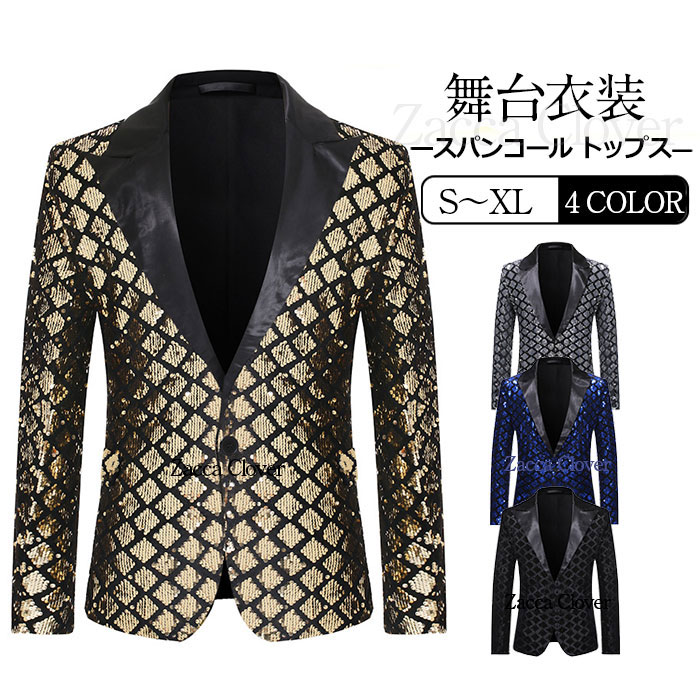 スパンコール ジャケット メンズ ステージ衣装 舞台衣装 カラオケ衣装 男性 発表会 ダンス衣装 パーティ 司会 カラオケ 忘年会 新年会 ハロウィン クリスマス コスプレ ロイヤルブルー ゴールド