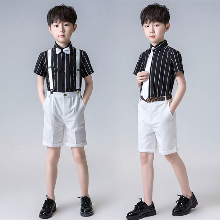子供スーツ 男の子 サスペンダー付き 4点セット シャツ ズボン ネクタイ キッズスーツ ベビー フォーマル スーツ ブラック ストライプ 90 100 110 120 130 140 150 160
